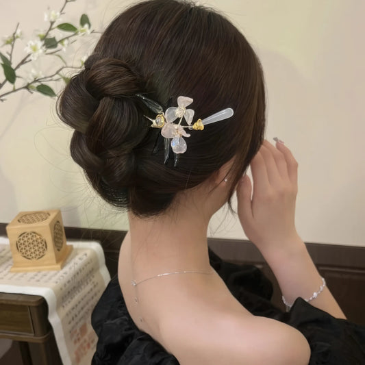 Cultural Story Step - shakes (bu yao), traditional Chinese hair ornaments, symbolize grace and the art of movement—their dangling parts “shake with steps,” echoing ancient elegance. Flowers represent natural beauty and vitality, while wind chimes carry connotations of tranquility and good wishes. This “Flower...