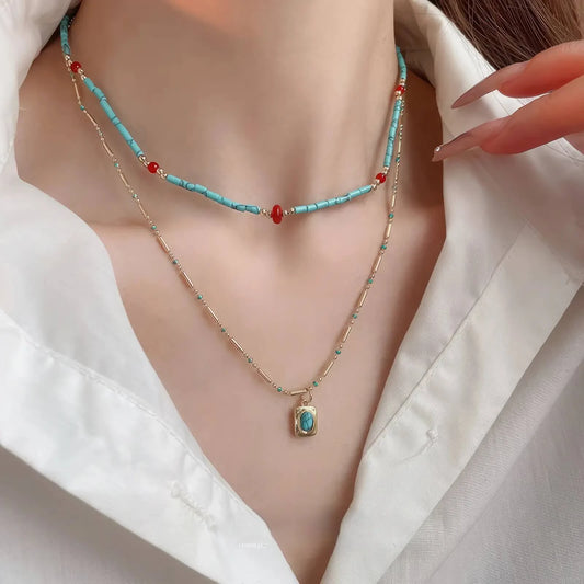 • Double - layer bohemian stone bead necklace, turquoise and red beads, displayed in box