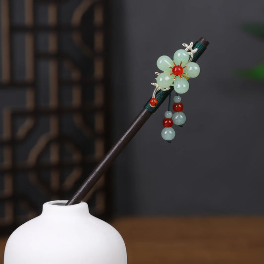• Youqing hairpin with green flower and green beads, brown background with wooden elements