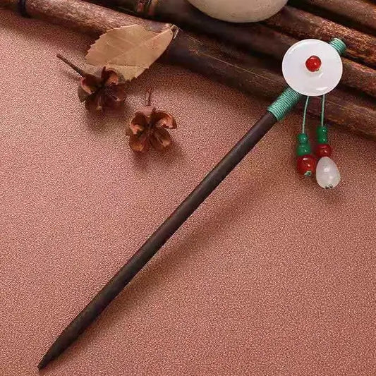 • Yuhong hairpin with white circular ornament, green beads, red decorations, brown background with wooden elements